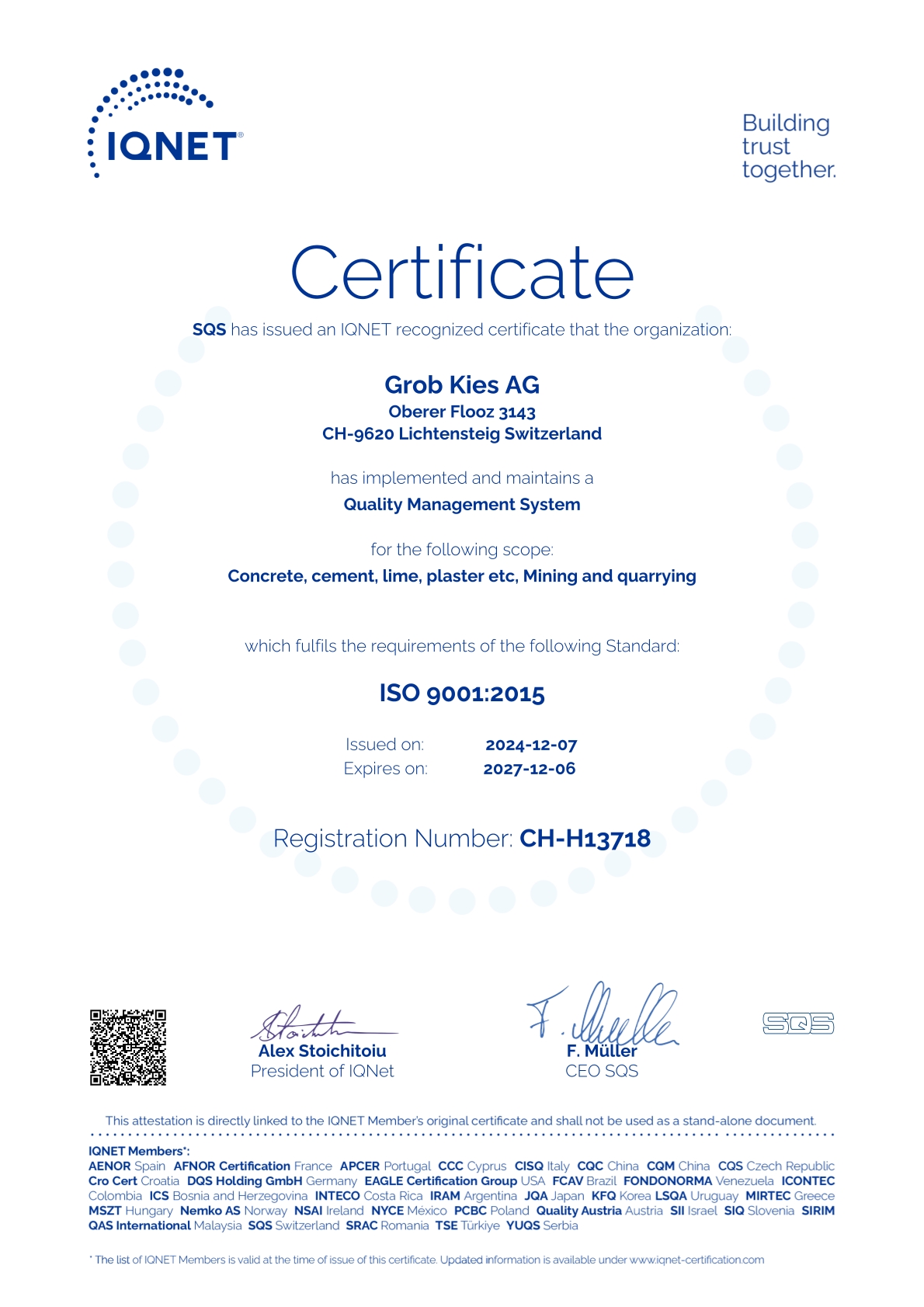 Die Betriebe der Grob Kies AG unterstehen seit 1975 der Betriebskontrolle des Fachverbandes der Schweizerischen Kies- und Betonindustrie FSKB (www.fskb.ch).