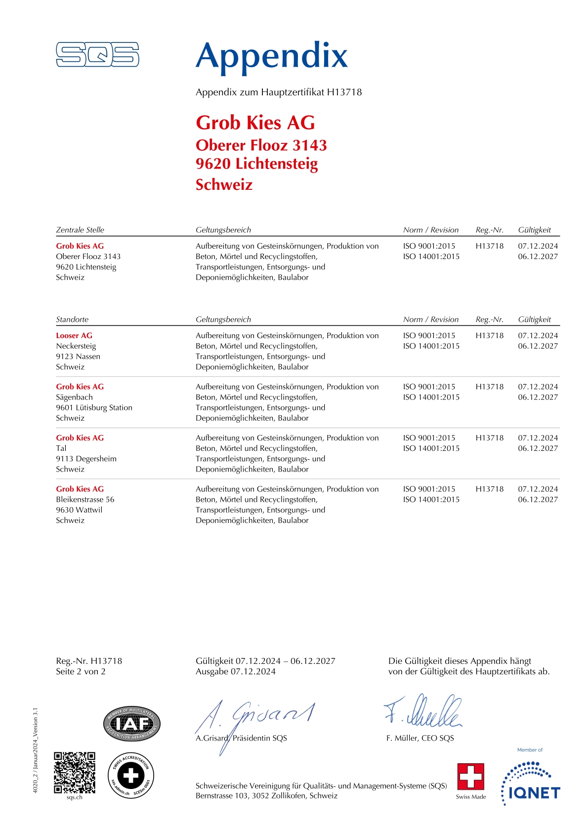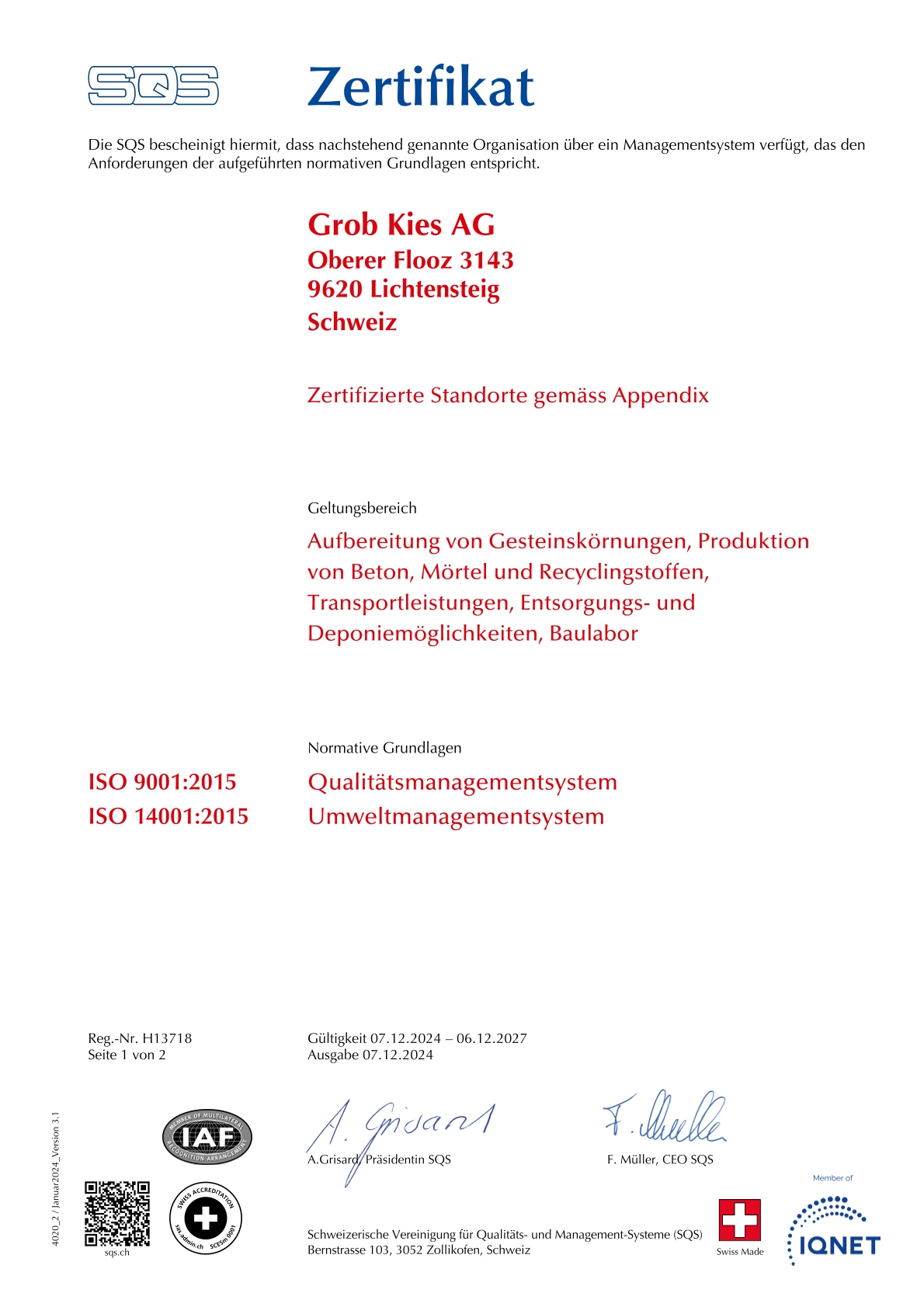 Die Inspektionen wurden seither bei allen Betriebsteilen ohne Ausnahme bestanden. Seit 1997 sind die Grob Kies AG und die Looser AG durch die SQS zertifiziert nach ISO 9001, ISO 14001, OHSAS 18001 und EKAS Branchenlösung.