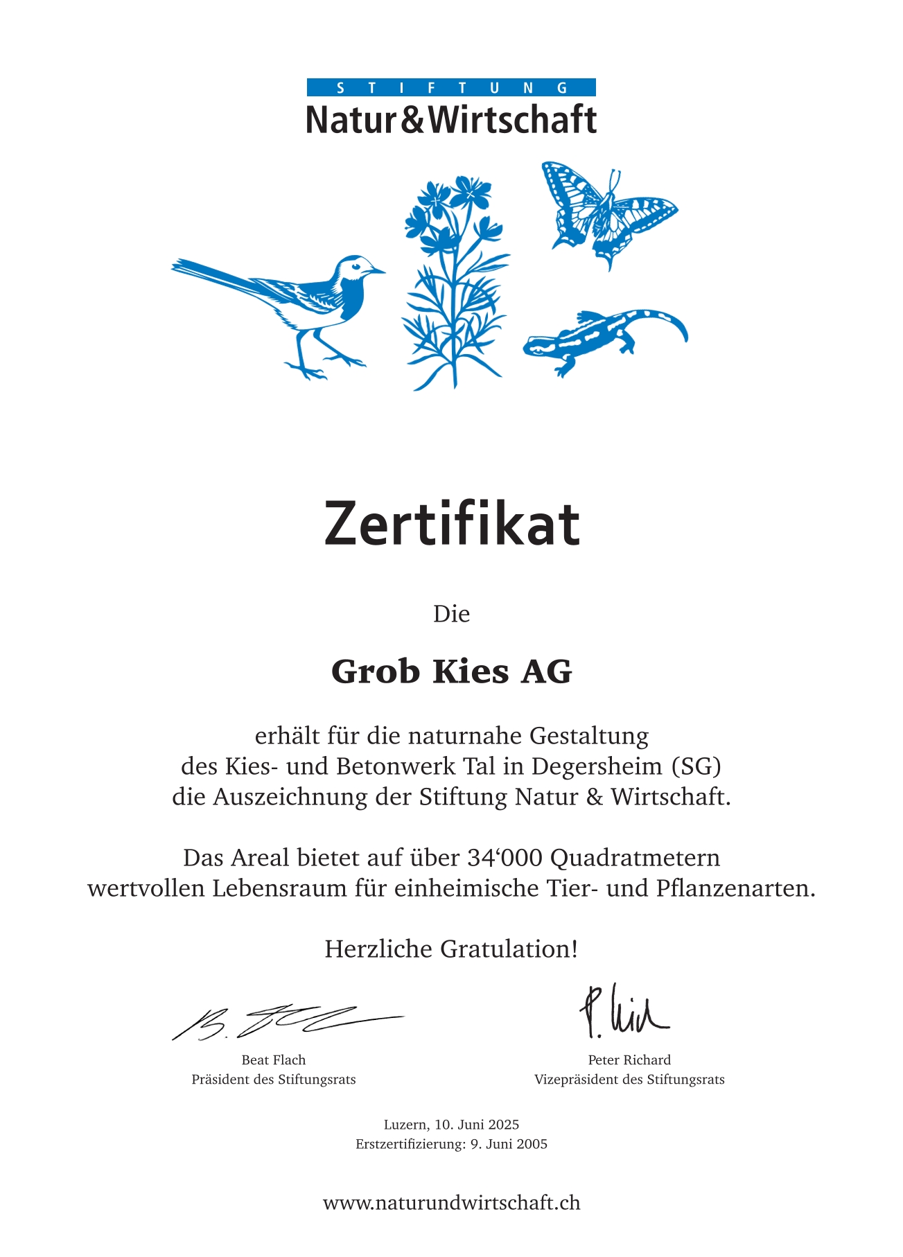 2020 Zum vierten Mal erhält Grob Kies AG für das Kies- und Betonwerks Tal in Degersheim die Auszeichnung für naturnahe Gestaltung der Stiftung Natur & Wirtschaft.
